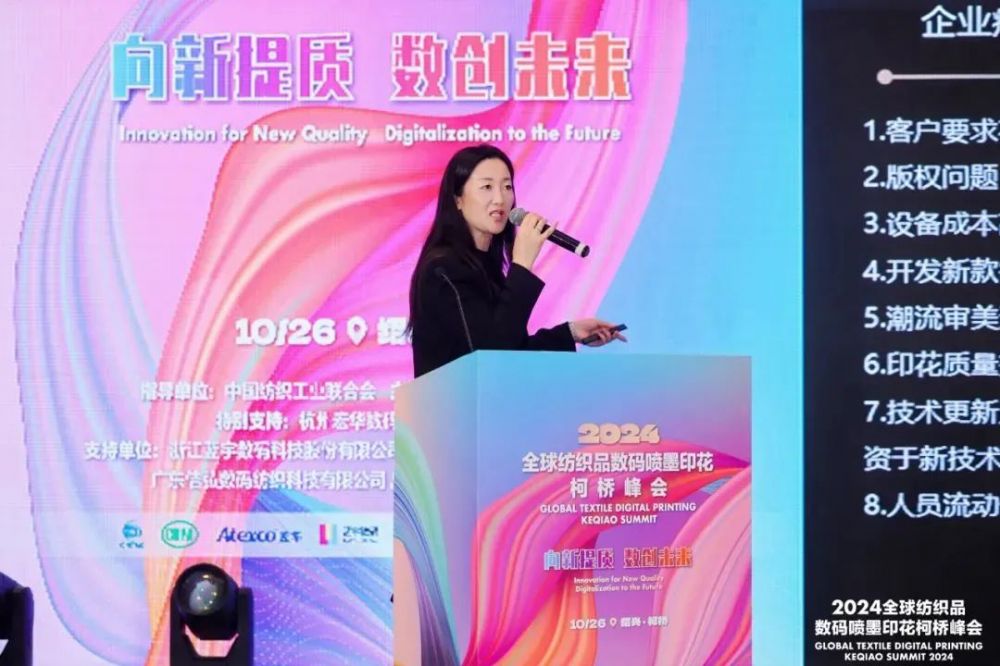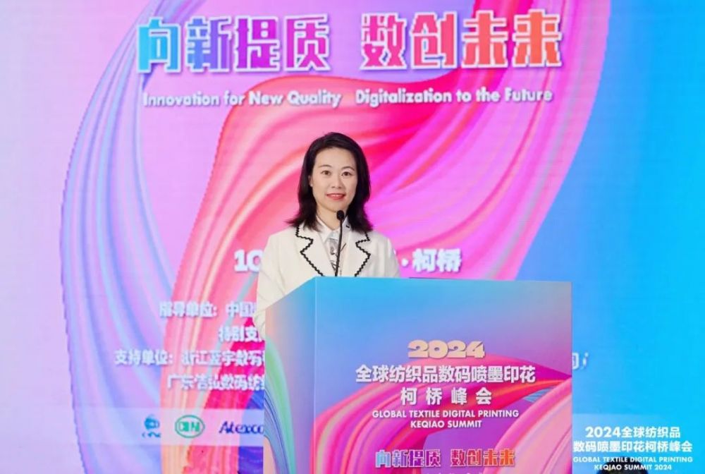 “數碼噴墨印花集數字化、時尚化、綠色化為一體,具有高創新性、高協同性、高價值性等特征,近年來市場規模快速增長,并加速與諸多行業、領域、業態深度融合,在塑造紡織行業發展新動能新優勢方面的作用日益突出。”中國紡織工業聯合會副會長閻巖致辭時表示,本屆峰會與會代表共同探討新時期數碼噴墨印花行業高質量發展的關鍵路徑,必將進一步凝聚行業共識,提升數碼噴墨印花產業基礎高級化和產業鏈現代化水平。她指出,數碼噴墨印花技術發展日新月異,產業內涵日益豐富,為紡織印染行業培育和發展新質生產力、加快推進現代化產業體系建設注入了新的力量。為推動行業高質量發展,她提出三點建議,一是加快關鍵核心技術攻關,以科技創新推動產業升級;二是加強與數字經濟深度融合,推進數字化智能化發展;三是堅持以消費者需求為導向,提升高端產品供給能力。