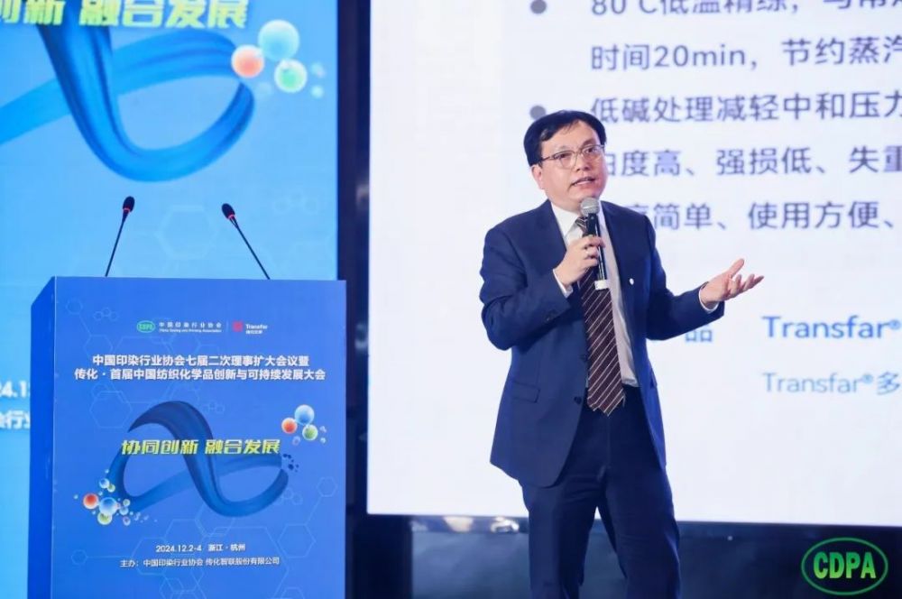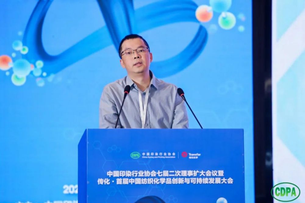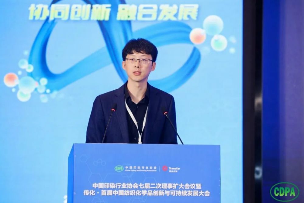 傳化化學全球應用技術總工程師金澤作題為《綠色創新技術助力印染企業低碳可持續發展》的報告。他表示,傳化積極投身綠色創新技術開發,助力印染企業低碳可持續發展。他結合前處理、染色、后整理等印染生產流程,介紹了傳化研發的功能性、綠色化高效產品,及其他低碳創新產品和方案,如萊賽爾纖維鏈間鎖合技術、無酚尼龍環保固色劑等。