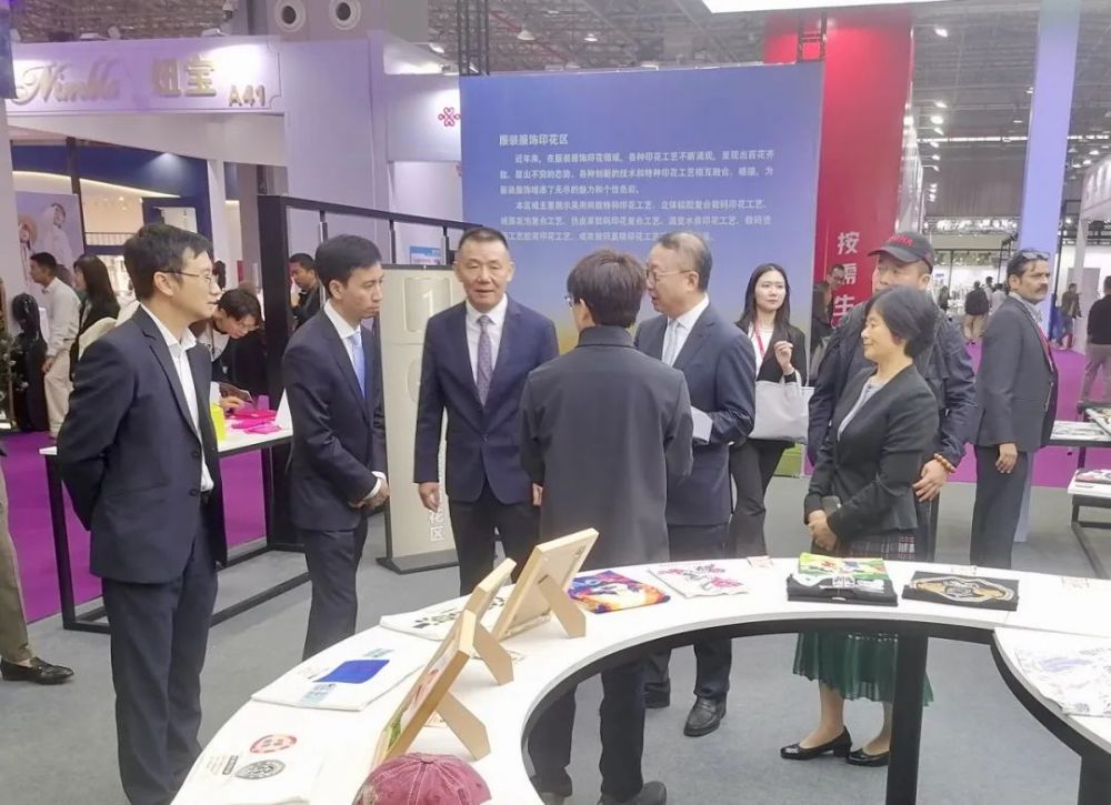 開幕式后,中國紡織工業(yè)聯(lián)合會會長孫瑞哲、中國紡織工業(yè)聯(lián)合會副會長陳大鵬、中國印染行業(yè)協(xié)會會長林琳、紡織產(chǎn)品開發(fā)中心主任李斌紅、中國紡聯(lián)生產(chǎn)力促進部主任李波,虎門鎮(zhèn)黨委書記蔣亞軍、黨委委員黃沛民等領導來到“2024中國服裝服飾印花創(chuàng)意精品展”展區(qū)參觀指導。孫會長表示,當前服裝服飾印花領域正處于快速變革與拓展的關鍵時期,其未來有著廣闊的發(fā)展空間。比如專注于研發(fā)和生產(chǎn)印花材料的東莞長聯(lián)科技成功上市,不僅為自身發(fā)展注入強大動力,更是為整個服裝服飾印花行業(yè)樹立了標桿,增添行業(yè)發(fā)展的信心,讓眾多業(yè)內(nèi)人士看到了創(chuàng)新發(fā)展的光明前景。