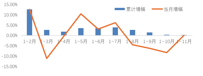 圖12. 2024年1-11月規模以上家紡企業內銷產值增長走勢
