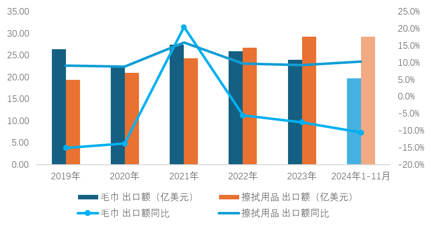 圖11. 2019-2024年(1-11月)我國出口毛巾產品和擦拭用品走勢