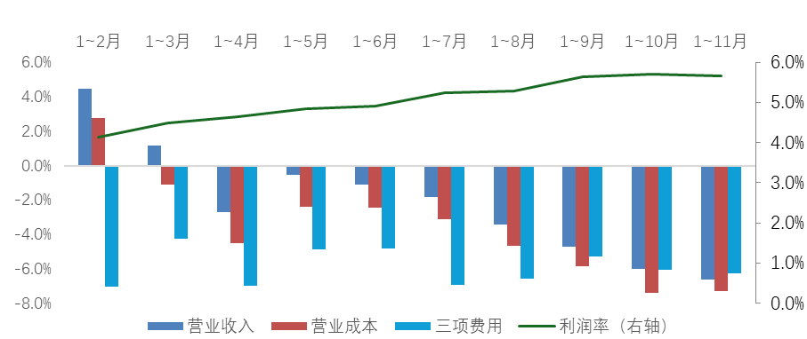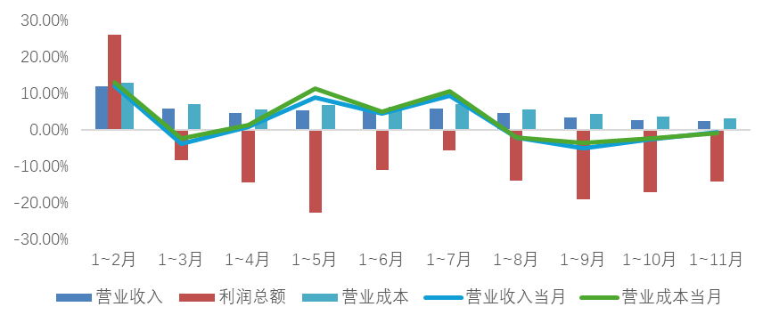 毛巾規模以上企業1-11月營業收入同比下降6.62%,延續了上年的下降趨勢,且降幅較今年前幾個月逐步加深;與此同時,受棉花價格回落的利好因素影響,規模以上毛巾企業營業成本同比上年繼續下降7.31%,利潤總額同比增長5.74%;全年利潤率呈現緩步提升態勢。