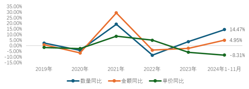 圖6. 2019-2024年(1-11月)我國家用紡織品出口數量、金額、單價同比走勢