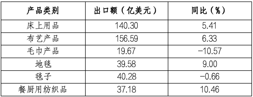在我國出口的主要6大類家用紡織品中,床上用品、布藝產品、地毯和餐廚用紡織品1-11月出口實現增長。毯子產品略降,毛巾產品下降幅度最為顯著。