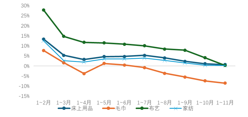 床上用品和布藝兩大子行業1-11月內銷產值在保持上年水平上小幅增長。據國家統計局數據測算,床上用品和布藝規模以上企業1-11月內銷產值同比分別增長0.72%和0.3%,增速較前幾個月有所放緩。毛巾內銷進一步收縮,1-11月毛巾規模以上企業內銷同比下降8.48%,降幅較前幾個月進一步加深。