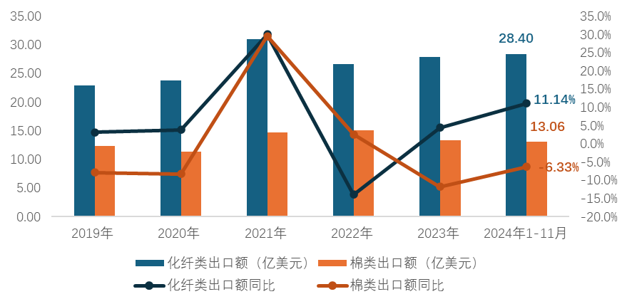 圖8. 2019年-2024年(1-11月)我國化纖類、棉類床上用織物制品出口走勢
